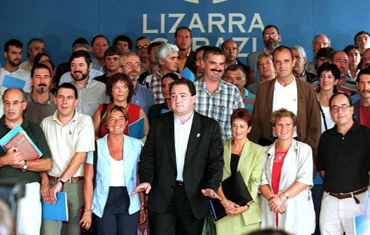 Bil-02. Durango (Vizcaya).- Los firmantes del «Pacto de Lizarra-Garazi» que hoy cumplía su primer año posaron tras celebrar una reunión hoy en Durango en la que consensuaron un manifiesto y el próximo plan de trabajo. EFE/Txema Fernández