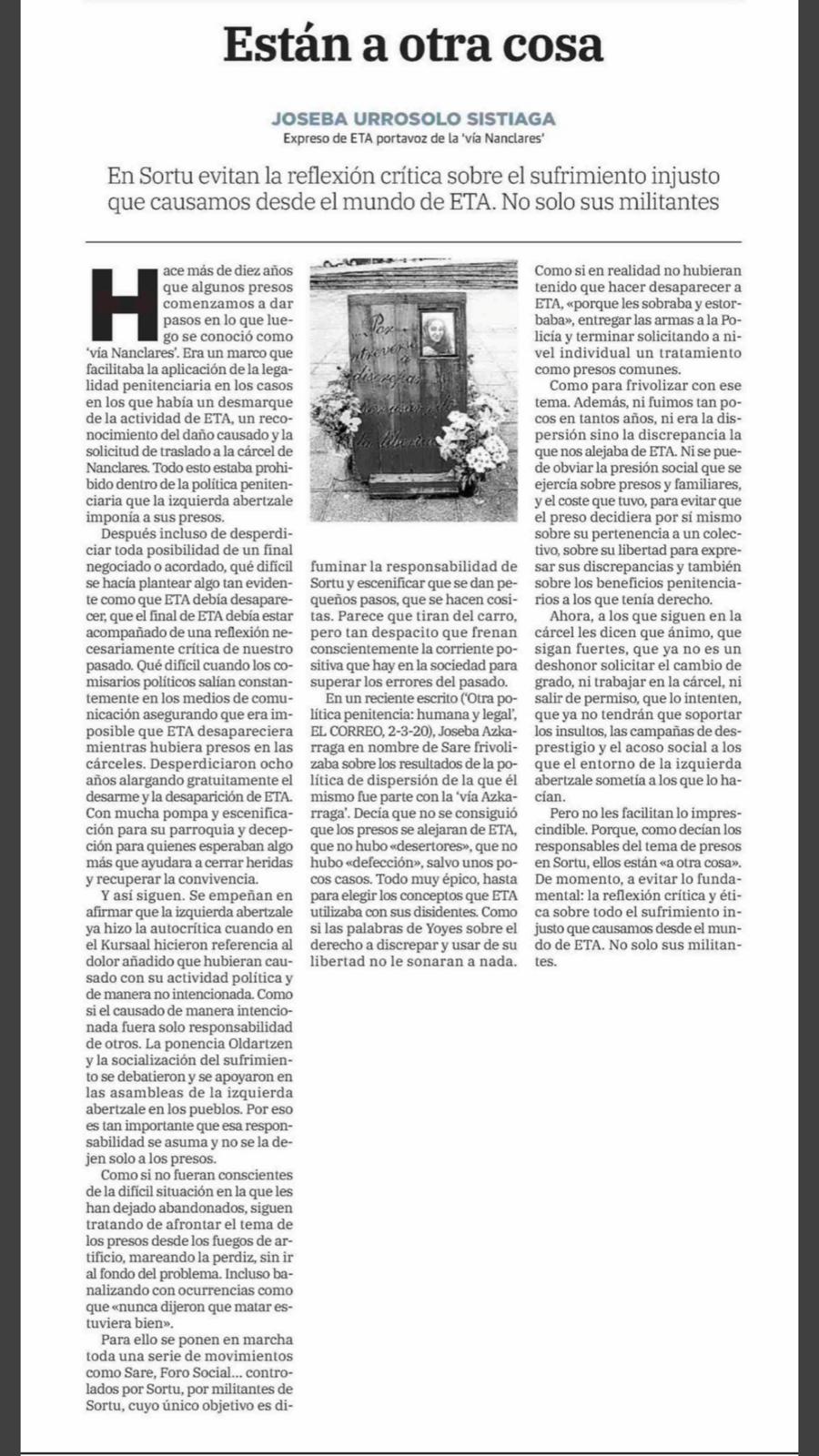 A raíz del mencionado artículo, se han publicado dos a lo que queremos dar especial eco por la importancia de los colectivos a los que pertenecen sus autores -Joseba Urrosolo Sistiaga, preso disidente de ETA y miembro de la llamada Vía Nanclares, y Edurne Albizu Ormazabal, familiar de una víctima de ETA- y por el propio contenido de los mismos. Ambos son un cúmulo de verdades que difícilmente se pueden contestar.