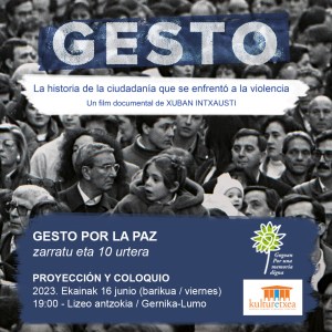 Animamos a la ciudadanía catalana a que se acerque a ver ‘GESTO’ que es un recorrido por los 30 años de trabajo por la paz y en contra de la violencia en Euskal Herria. Este viaje que emprenden las personas protagonistas de Gesto por la paz a través de la visualización de imágenes del pasado, invita al espectador a descubrir que los fundamentos, las acciones y los principios éticos de la organización pacifista continúan vigentes hoy en día.