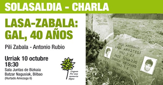 Con motivo del 40 aniversario del primer secuestro y asesinato de los GAL, el de Joxean Lasa y Joxi Zabala el 15 de octubre de 1983, la asociación ‘Gogoan, por una memoria digna’ organizará el martes, 10 de octubre, una charla con el título «Lasa-Zabala: GAL, 40 años» en la que intervendrán Pili Zabala y Antonio Rubio.