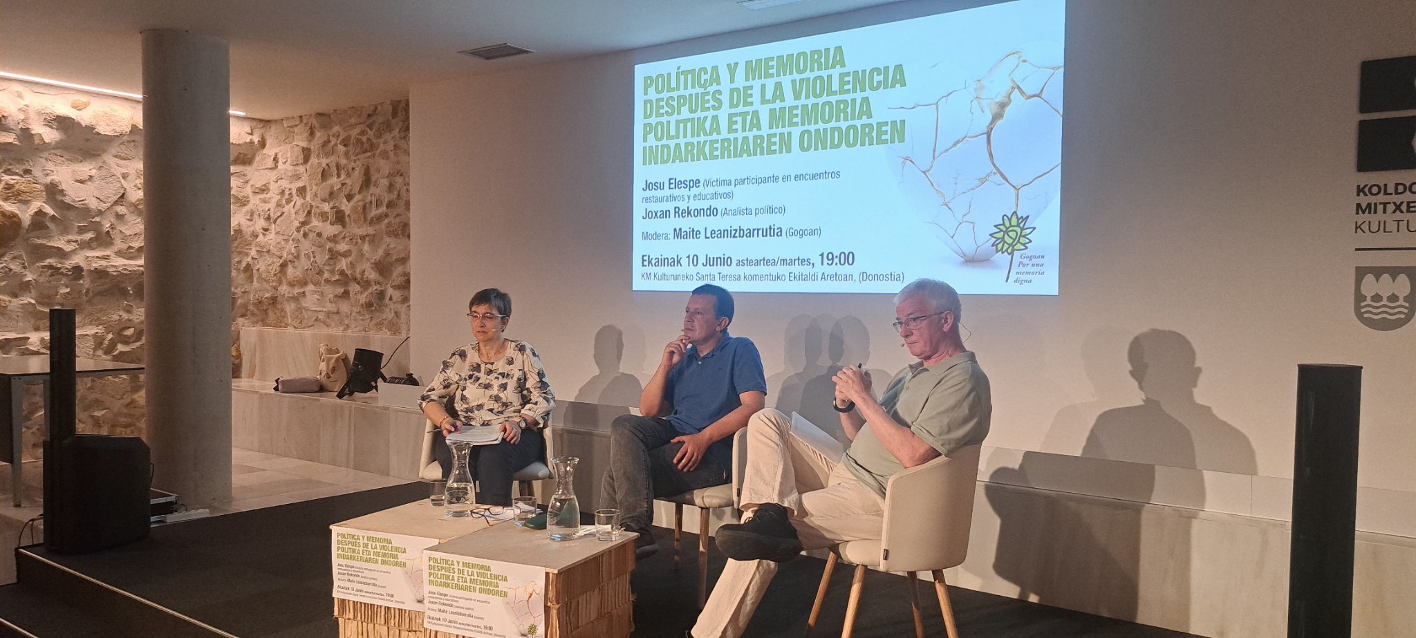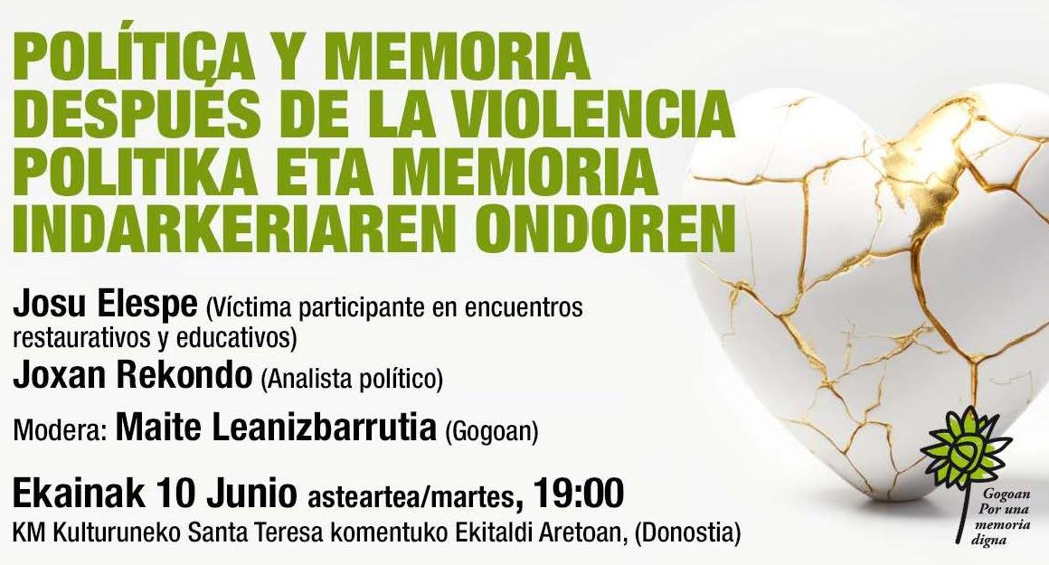 La Asociación Gogoan, por una memoria digna ha organizado para el miércoles 4 de junio, un diálogo entre el filósofo Reyes Mate y el ex miembro de ETA Ion Aldalur. Reyes Mate, filósofo del CSIC, es experto en reflexión sobre la memoria, los vencidos y el papel de la filosofía después del Holocausto y Auschwitz. En 2009 se le concedió en España el Premio Nacional de Literatura – Ensayo por su obra La herencia del olvido. Por su parte Jon Aldalur participó en el secuestro y asesinato del empresario guipuzcoano Ángel Berazadi. Aldalur ha destacado en los últimos años por su fuerte autocrítica y su labor de apoyo a las víctimas del terrorismo.