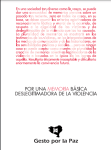 Toda la actividad de Gesto por la Paz ha ido claramente dirigida a la deslegitimación de la violencia. Todo relato que se construya debe partir de la defensa de los derechos humanos para todas las personas y debe poner en primer lugar a las víctimas, como el trágico e irreparable logro que ha generado la violencia. Se debe construir
