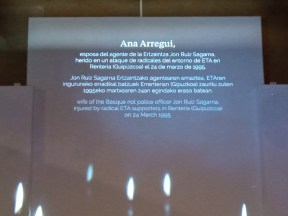 El terrorismo de ETA ocupa un lugar relevante como no podía ser de otra manera, teniendo en cuenta el número de víctimas ocasionadas y el tiempo que ha pervivido en nuestra sociedad. Prácticamente, al incorporarte al museo hay una sala en la que se escuchan testimonios de víctimas del terrorismo. Todos ellos son impactantes, pero hemos seleccionado las palabras de Ana Arregui: