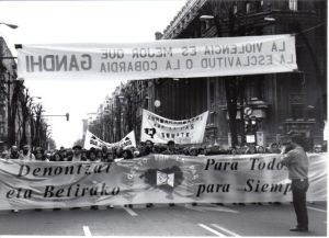 Gesto por la Paz no solo se manifestó contra la violencia de ETA. La convicción pacifista les llevó a protestar, desde el principio, contra las distintas violencias que vivimos en aquellos años y que incluían las actuaciones de los GAL, la tortura y la represión por parte de las fuerzas de seguridad del Estado; también se manifestaron contra la política de dispersión de presos. Incluso convocaban concentraciones cuando moría un miembro de ETA porque entendían que esa muerte también era innecesaria y no debería haber ocurrido. Desarrollaron, desde la pluralidad ideológica de sus filas, la teoría de la deslegitimación de toda violencia. En una época tan tensionada en la que todo se entendía en clave de “conmigo o contra mí” defender estas posturas era ir a contracorriente, buscarse la enemistad de unos y otros, habitar un espacio de incomodidad que solo la convicción y la coherencia por el respeto a los derechos humanos podía justificar.