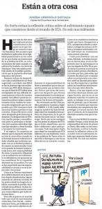 Sin embargo, esto es una simple anécdota, si continuamos con su lectura porque también cuestiona la política de dispersión: «Esa política no alcanzó sus objetivos puesto que ETA tomó la decisión de dejar la violencia 22 años después, sin que aquella defección se produjera salvo en algunos casos«, obviando el trato que dio ETA a quienes se reinsertaron o el denso trabajo que hizo la izquierda abertzale sobre quienes salían de la cárcel por esta vía.